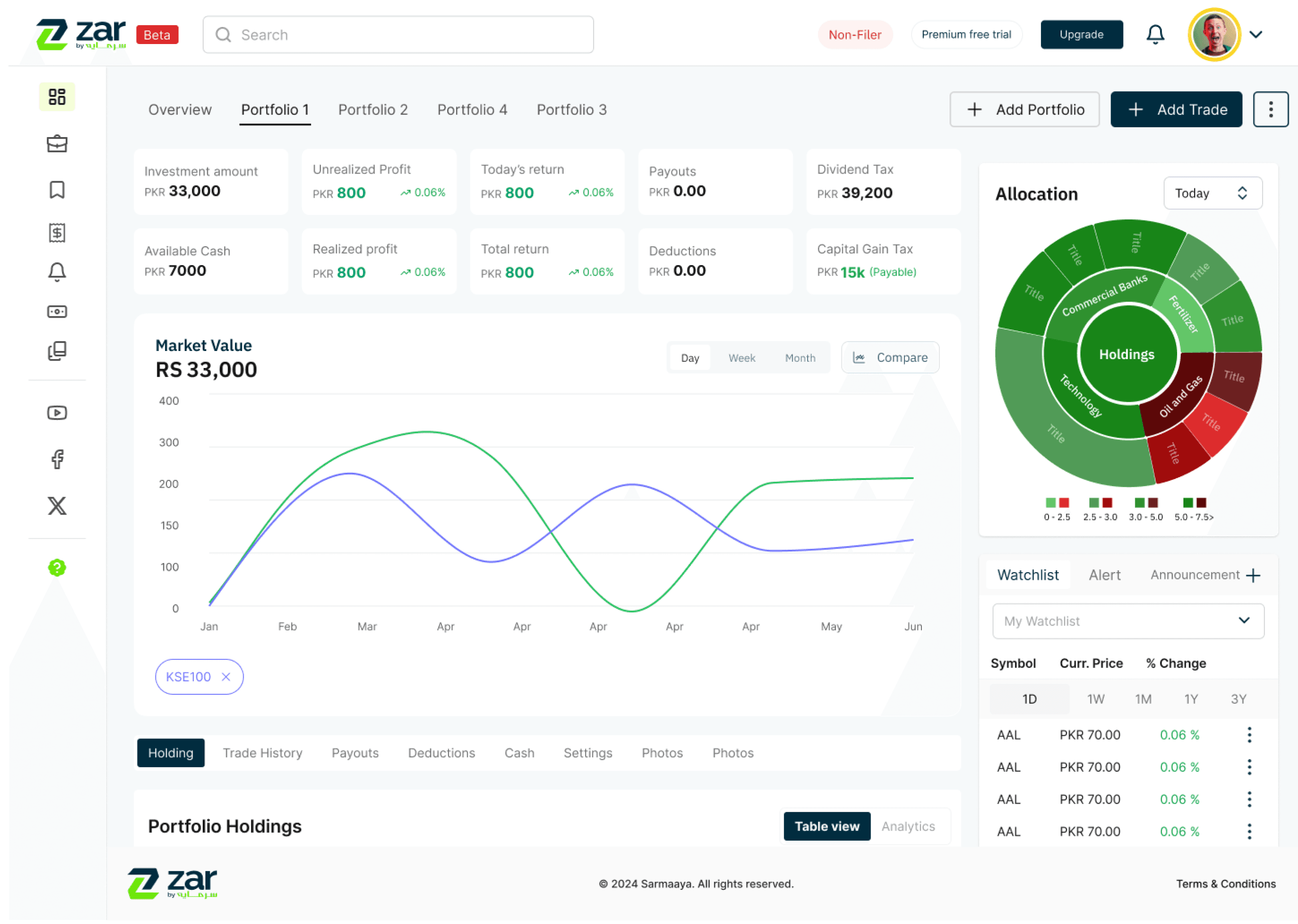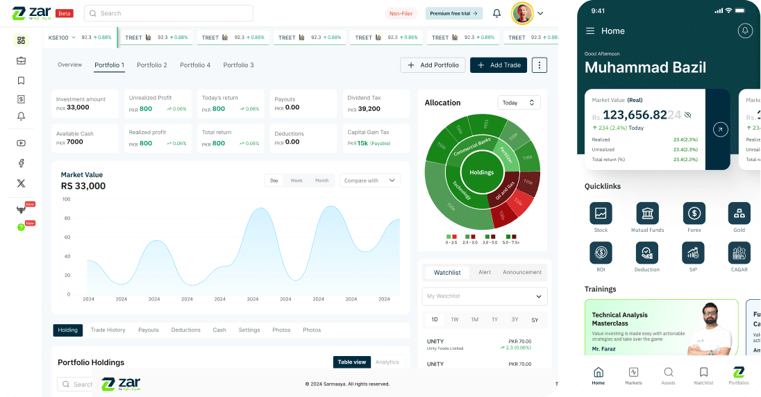 Zar by Sarmaaya is a portfolio management platform that helps retail investors in Pakistan track multiple stock portfolios in one place. Existing broker apps lacked clarity, making it hard for users to monitor performance.